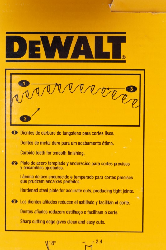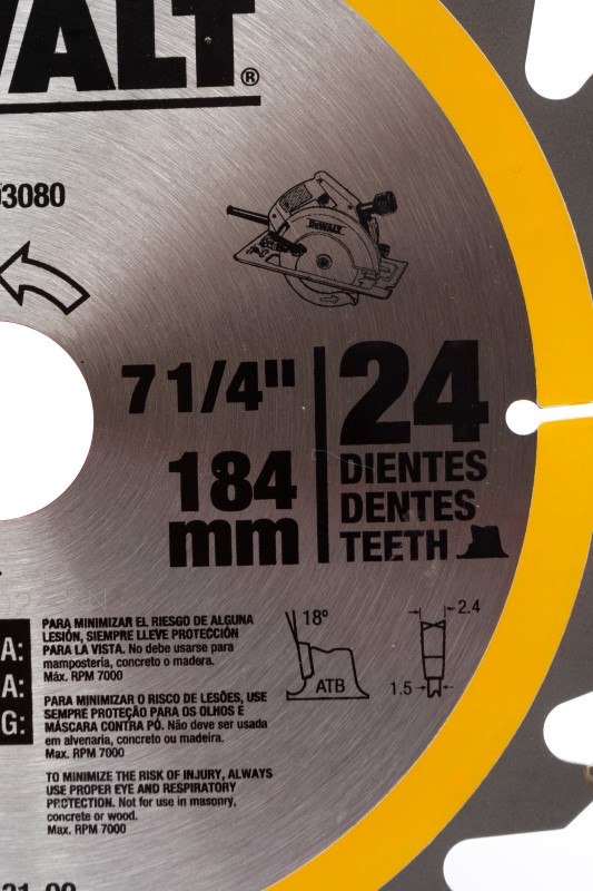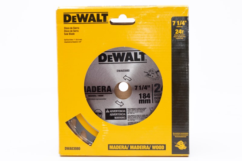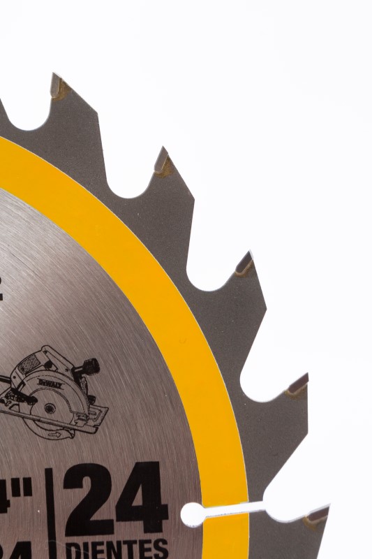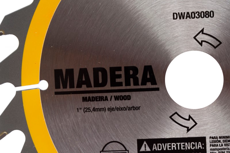 DWA03080. Disco para Trabajo en Madera. Corte General. Diametro 7.1/4" ( 184mm). 24 dientes. Eje 1" (25.4mm). Adaptadores 3/4"-5/8". Perfil del Diente ATB. Ángulo del gancho positivo. Espesor de la hoja 0.059" y Espesor del diente 0.102"