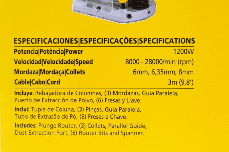 Motor 1.200W para aplicaciones profesionales - 3 topes de profundidad ajustables - interruptor en el mango con bloqueo para trabajo continuo - Mango con superficie antideslizante - Control de profundidad con sistema de micro-ajuste, para mayor precisión y acabado. Incluye: Guia paralela - Velocidad: 8.000-27.000 RPM -Collet: 6, 6,5 y 8mm - Base: Semicircular - Aplicaciones: Construcción, instalaciones de puertas y cocinas y artesanos. Incluye 6 fresas y llave de ajuste.
