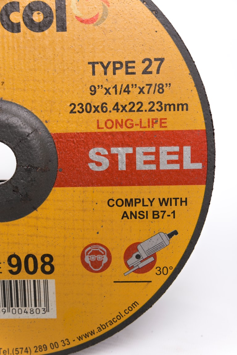 Disco Abrasivo con centro deprimido T27, Dureza T para satisfacer toda necesidad de pulido y desbaste sobre metales. Para operaciones exigentes en fundiciones y montaje industrial. Mejor presion en el trabajo con reducción en el costo de operación. Dimensiones 9" (228mm) X 1/4"(6mm) X 7/8"(22mm). Grano Oxido de Aluminio A24.