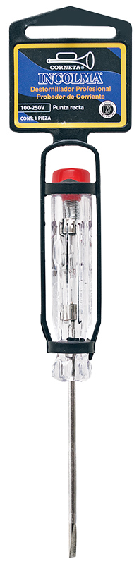 Probador de corriente con mango Plástico y con recubrimiento. Cumple con las normas del VDE. Detecta en vivo parte de un circuito eléctrico no mayor a 250 voltios.