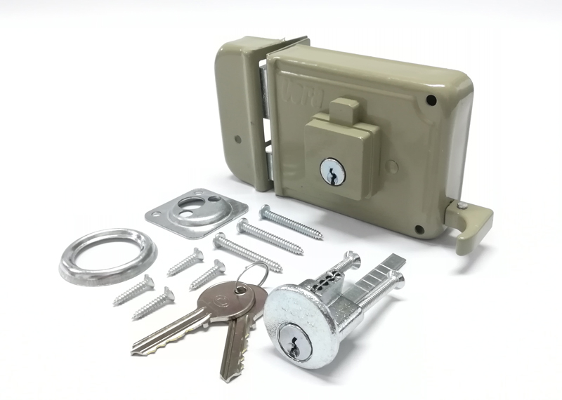 Cerradura de sobreponer para puerta principal, disponible para apertura del lado izquierdo. Instalación en cuerpos de madera o laminados metálicos. Macho en zamak que se acciona totalmente con tres giros de la llave y bloqueo del picaporte en la posición final del macho. Permite instalación con soldadura en puertas metálicas. Centro de instalación estándar a 50 mm. Cilindro de 5 pines. Para Determinar el Lado de la Puerta, Deberás Pararte Frente al Exterior. Si las Bisagras Están en el Lado Derecho, La Puerta es Derecha y si las Bisagras Están Instaladas del Lado izquierdo, La Puerta es Izquierda.