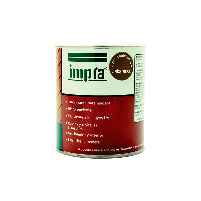 Lasur formulado para la proteccion y decoracion de la madera que no genera pelicula. Trabaja a poro abierto y tiene acabado mate. Fungicida e inmunizante, protege la madera e inhibe la formacion del hongo de la mancha azul. Hidrofugo, proteje la madera de la intemperie y de la accion de los rayos UV. Contiene aglomerante a base de recinas uretanicas naturales. Rendimiento Teorico: 24 metros cuadrados por galon. Presentación por cuarto de galon. Referencia 0494961 de Impra