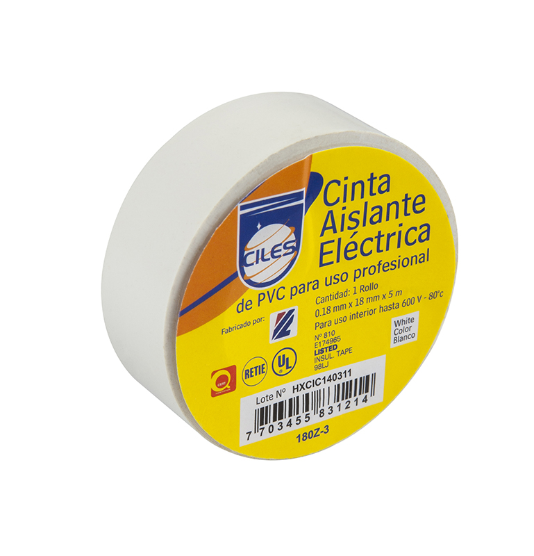 Cinta asilante eléctrica de PVC para uso profesional en trabajos de baja tensión y en interior. Soporta hasta 600V a 80°C. Medidas: 0,18mm x 18mm x 5 mts. Cumple RETIE. Color blanco. Referencia 842300B de Ciles.