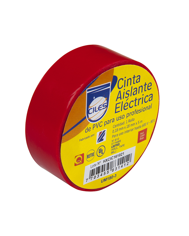 Cinta asilante eléctrica de PVC para uso profesional en trabajos de baja tensión y en interior. Soporta hasta 600V a 80°C. Medidas: 0,18mm x 18mm x 5 mts. Cumple RETIE. Color rojo. Referencia 842300R de Ciles.