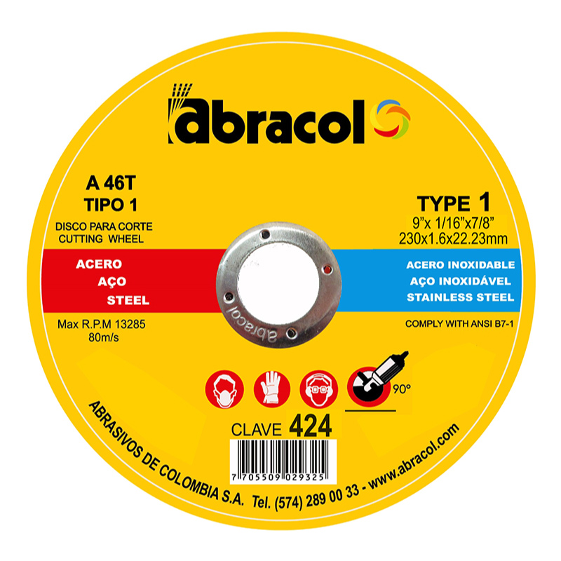 ABD2A0046094. Disco Abrasivo Plano T1 Fabricado en Oxido de Aluminio Grano A46, desperdicio mínimo de material, ideal para cortes precisos y limpios en metales ferrosos y Acero Inoxidable. No contamina por ser libre de hierro, cloro y plomo. Dimensiones 9" (230mm) X 1/16"(1.6mm) X 22mm. Reemplaza al 5404.
