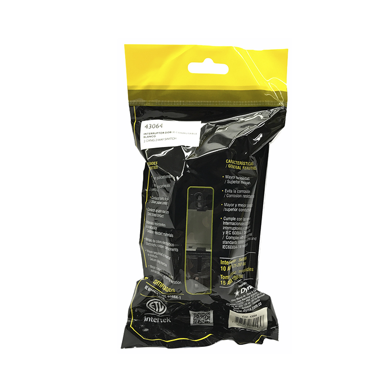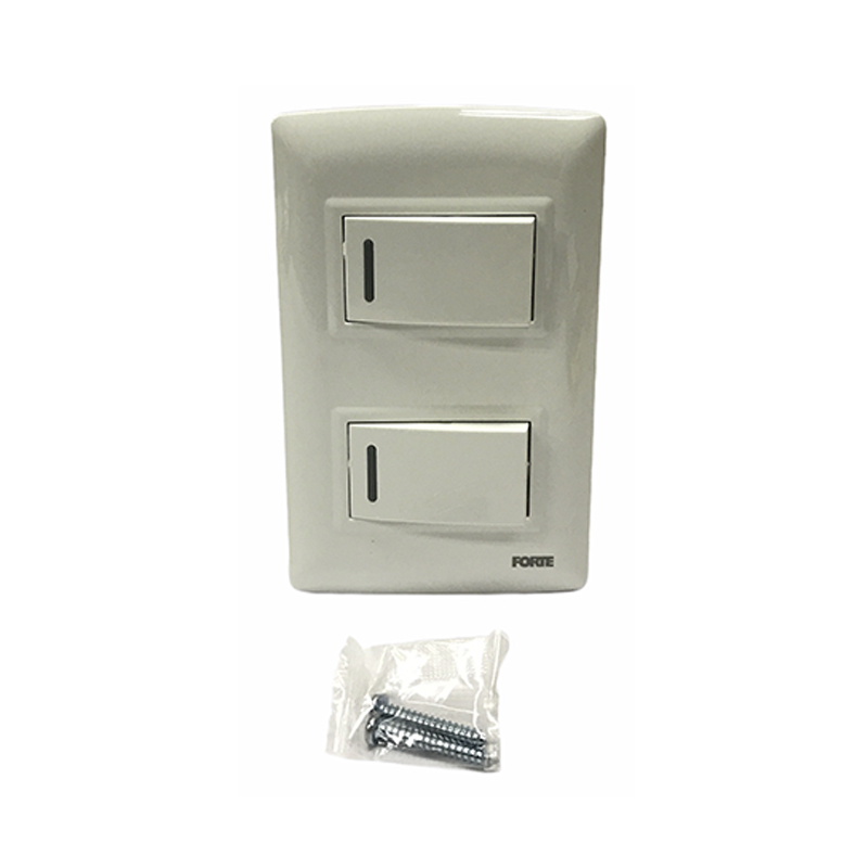 Interruptor doble para incrustar en la pared. Para el encendido y apagado de circuitos de iluminación con bombillos incandescentes, flourescentes, ahorradores y LED. Permite el control ON/ OFF de luminarias y circuitos desde dos lugares diferentes. Fabricado en policarbonato, contactos punto de plata y herrajes en cobre. . Funciona con un voltaje a 125 a 250 V para el uso en circuitos de 10 Amp. Dimensiones: 118mm*73mm. Indicado para instalaciones residenciales y comerciales. Cumple con normas internacionales IEC y con RETIE . Serie L10 de FORTE. Referencia L1022S.