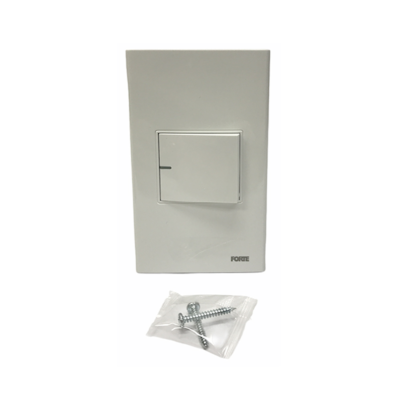 Interruptor sencillo para incrustar en la pared. Para el encendido y apagado de circuitos de iluminación con bombillos incandescentes, flourescentes, ahorradores y LED. Fabricado en policarbonato, contactos punto de plata y herrajes en cobre. Funciona con un voltaje a 125 a 250 V para el uso en circuitos de 10 Amp. Dimensiones: 118mm*73mm. Indicado para instalaciones residenciales y comerciales. Cumple con normas internacionales IEC y con RETIE . Serie A10 de FORTE. Referencia A1011.