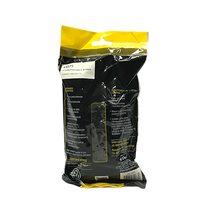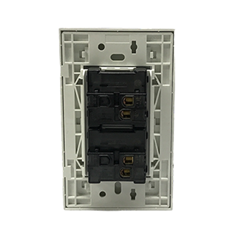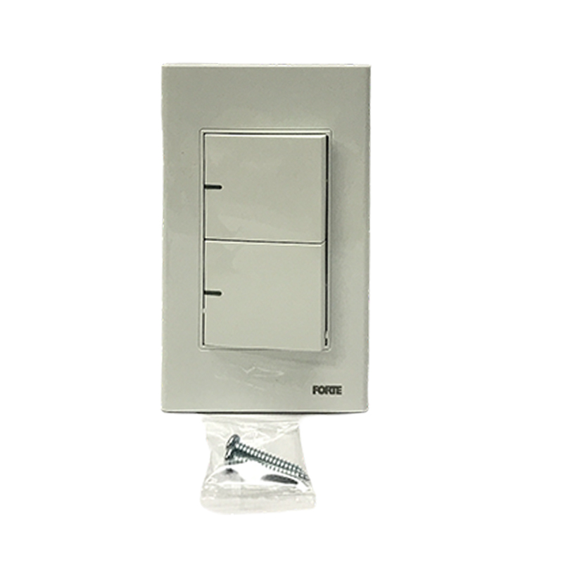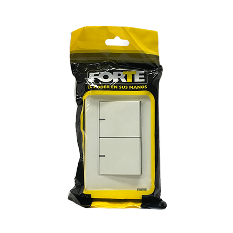 Interruptor doble para incrustar en la pared. Para el encendido y apagado de circuitos de iluminación con bombillos incandescentes, flourescentes, ahorradores y LED. Fabricado en policarbonato, contactos punto de plata y herrajes en cobre. . Funciona con un voltaje a 125 a 250 V para el uso en circuitos de 10 Amp. Dimensiones: 118mm*73mm. Indicado para instalaciones residenciales y comerciales. Cumple con normas internacionales IEC y con RETIE . Serie A10 de FORTE. Referencia A1021.