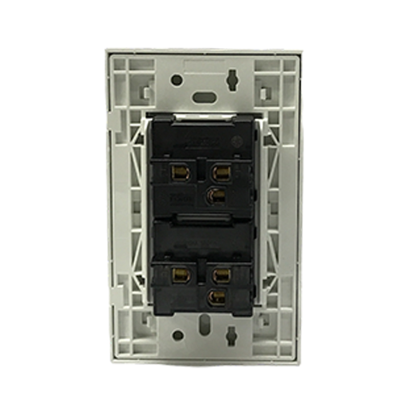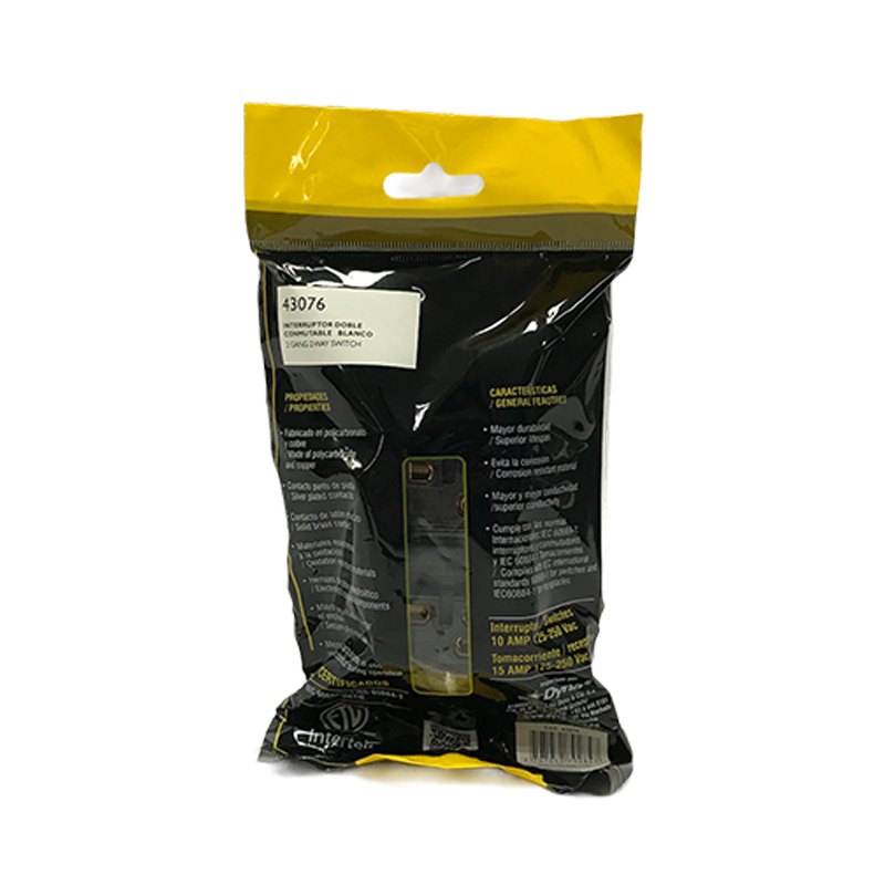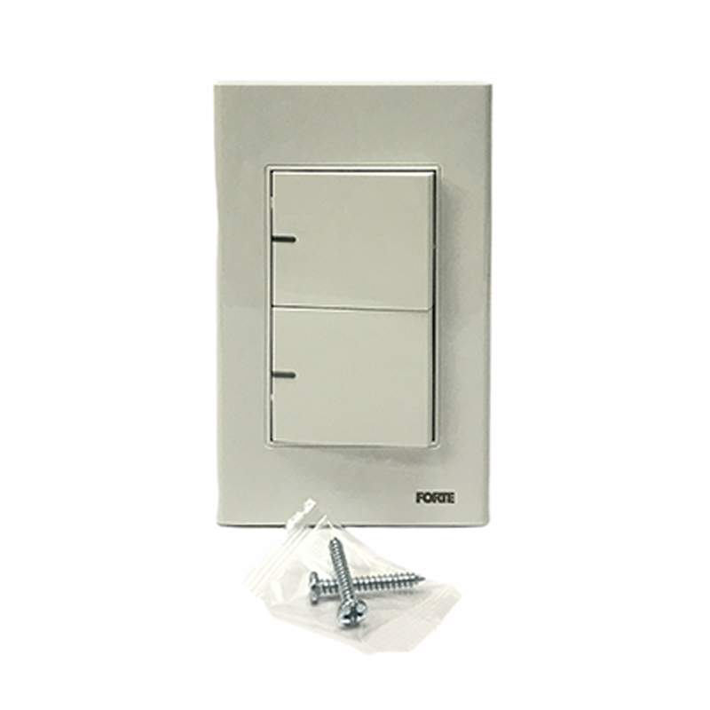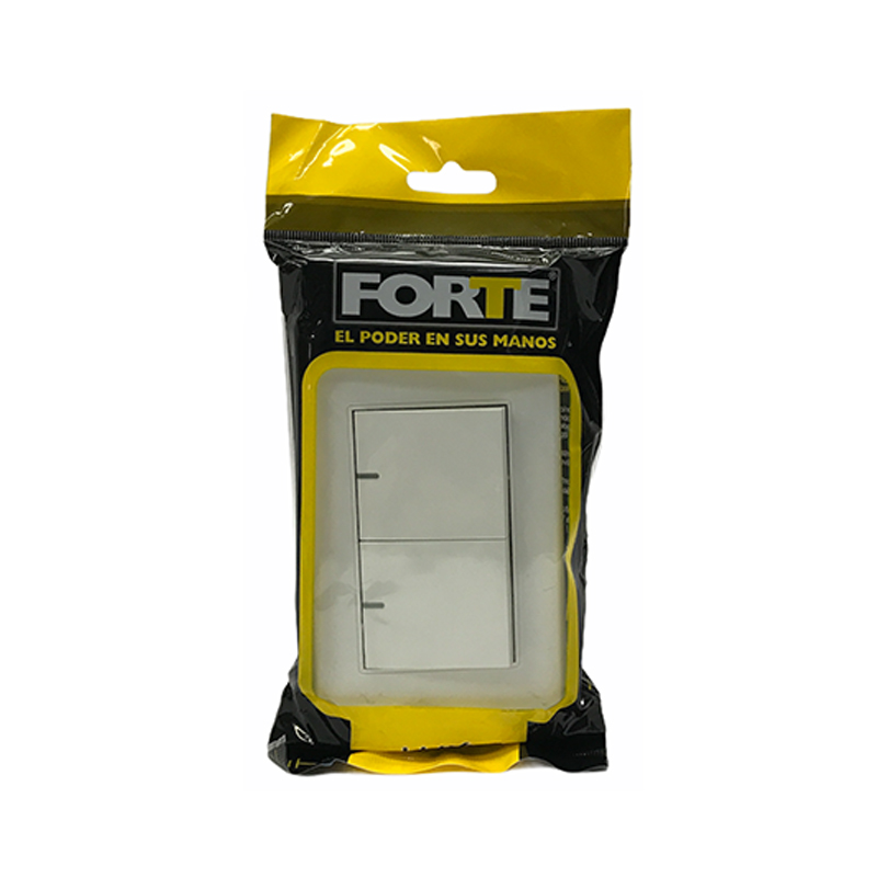 Interruptor doble para incrustar en la pared. Para el encendido y apagado de circuitos de iluminación con bombillos incandescentes, flourescentes, ahorradores y LED. Permite el control ON/ OFF de luminarias y circuitos desde dos lugares diferentes. Fabricado en policarbonato, contactos punto de plata y herrajes en cobre. . Funciona con un voltaje a 125 a 250 V para el uso en circuitos de 10 Amp. Dimensiones: 118mm*73mm. Indicado para instalaciones residenciales y comerciales. Cumple con normas internacionales IEC y con RETIE . Serie A10 de FORTE. Referencia A1022.