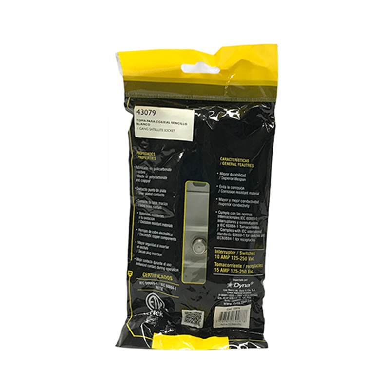 Toma con conector hembra para cable coaxial para incrustar en la pared, ideal para la conexión de señal del cable del televisor. Fabricado en policarbonato, contactos punto de plata y herrajes en cobre. Funciona con cable coaxial tipo RG59 y RG6. Impedancia característica de 75 Ohms. Dimensiones: 118mm x 73mm. Cumple con normas internacionales y con RETIE. Serie A10 de FORTE Referencia A1071.