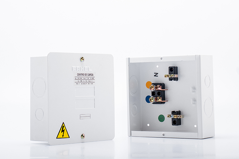Tablero bifasico de 2 circuitos 4 hilos de 240 voltios de 50 amperios, fabricado en lamina colled rolled calibre 20 Recubrimiento de pintura electroestática blanca. Sin puerta. Barrajes en aluminio. Referencia F2CB-4H de Famel.