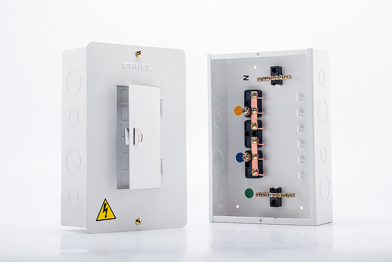 Tablero monofásico bifilar de 6 circuitos puerta 4 hilos de 120 voltios de75 amperios, fabricado en lamina colled rolled calibre 20 Recubrimiento de pintura electroestática blanca. Con puerta. Barrajes en cobre. Referencia F6CMP-4H de Famel.