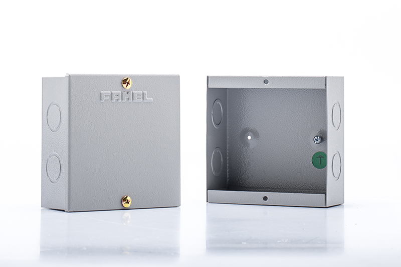Cajas de empalme de 12,5 x 12,5 x 5. Recubrimiento de pintura electroestática gris con 2 entradas de 7/8 y 1'1/8 por lateral. Tapa lisa. Referencia FCE125TL de Famel.