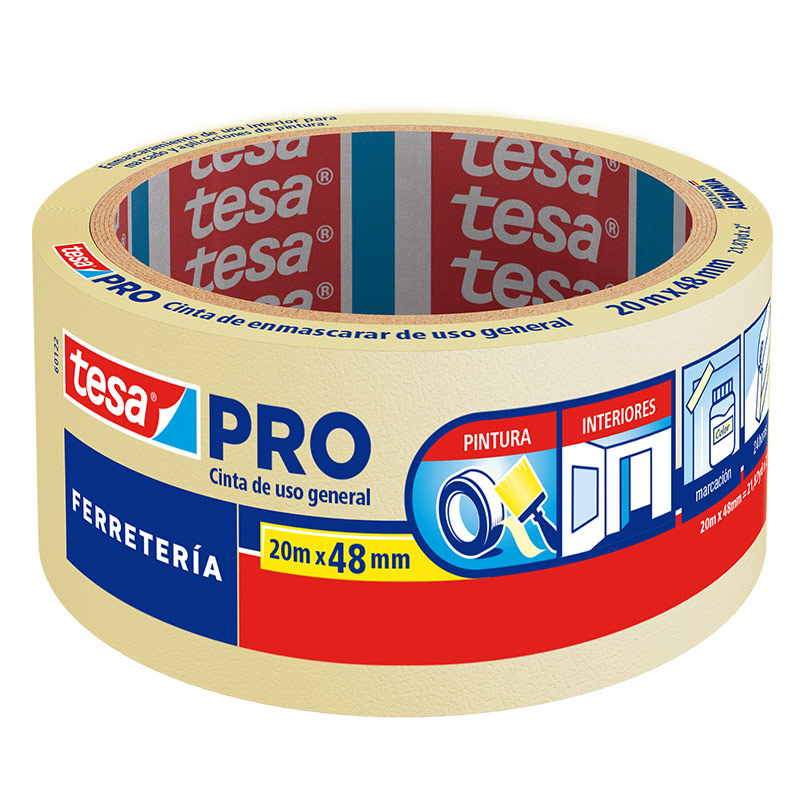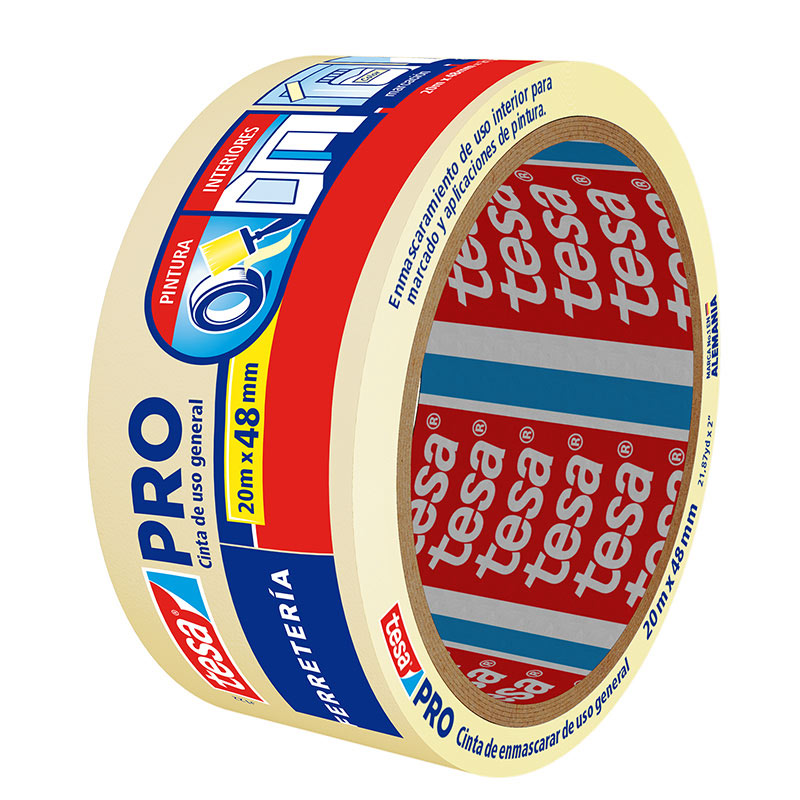 Cinta de enmascarar ferretera de uso general, grado economico. Adecuada adherencia en la mayoría de las superficies. Buena protección de la superficie. Usar en aplicaciones inferiores a 24 horas. Es una cinta multipropósito de papel crepado apropiada para usos generales de atar, sostenimiento, identificación, sellado y para la protección de superficies. Medidas 20 metros de largo x 48 milímetros de ancho. Referencia 60187-00015-00 de Tesa.