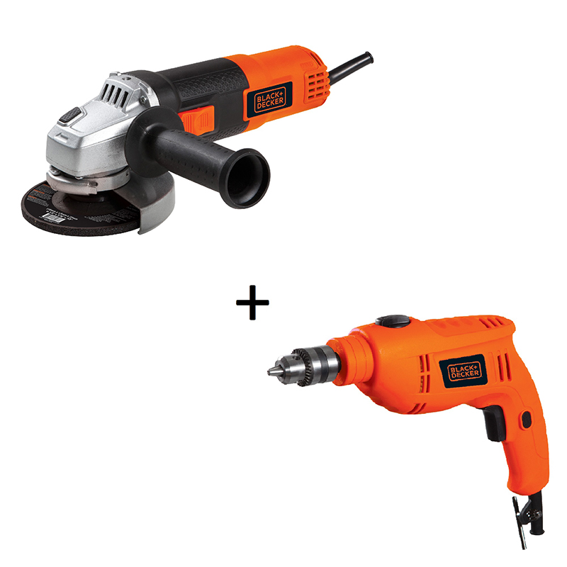 Minipulidora 4.1/2” G720 para corte, desbaste, pulido y esmerilado. Potencia 820W. 10.000 RPM. Eje 5/8” y cable 2 metros. Empuñadora lateral 3 posiciones e Interruptor lateral contra polvo. Guarda ajustable sin llave. + Taladro percutor 3/8” (10mm) 550W TP555 para perforar madera, metal, concreto, plástico y más materiales. Motor de 550W. Selector de percusión/rotación. Velocidad fija 2.800 RPM. Percusión 46.400 IPM. Traba para uso continuo. Capacidad en madera (20 mm) y concreto y acero (10 mm)