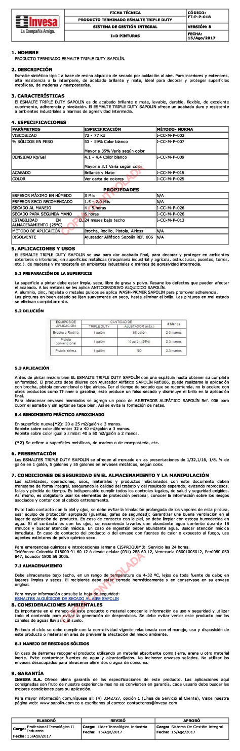 Esmalte sintético tipo 1 a base de resinas alquídicas de secado por oxidación al aire. Para interiores y exteriores, alta resistencia a la intemperie, de acabado brillante y mate, ideal para decorar y proteger superficies metálicas, de maderas y mamposterías. Lavable, durable, flexible, de excelente cubrimiento, adherencia y nivelación. Se usa para dar acabado final, para decorar y proteger en ambientes exteriores e interiores