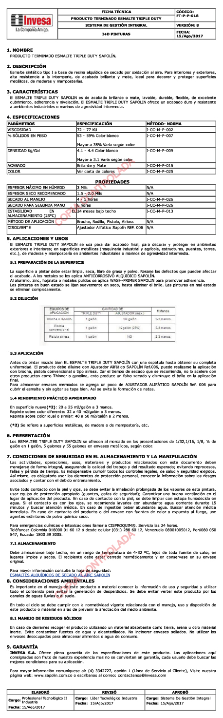 Esmalte sintético tipo 1 a base de resinas alquídicas de secado por oxidación al aire. Para interiores y exteriores, alta resistencia a la intemperie, de acabado brillante y mate, ideal para decorar y proteger superficies metálicas, de maderas y mamposterías. Lavable, durable, flexible, de excelente cubrimiento, adherencia y nivelación. Se usa para dar acabado final, para decorar y proteger en ambientes exteriores e interiores