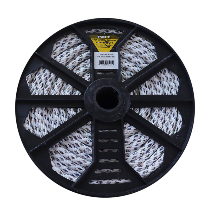 Soga trenzada al 100%, sin alma, con acabado de diferentes tonos, hecho con polipropileno al 20%, de alta tenacidad y poliester texturizado al 80%. Dimensiones del carrete altura 35 cm, tapa diametro 30 cms. Producto multiusos en ganadería, agropecuarios, carpas, amarres, camiones, mallas y artesanías. No se recomienda su uso para la línea de vida o deportes extremos.