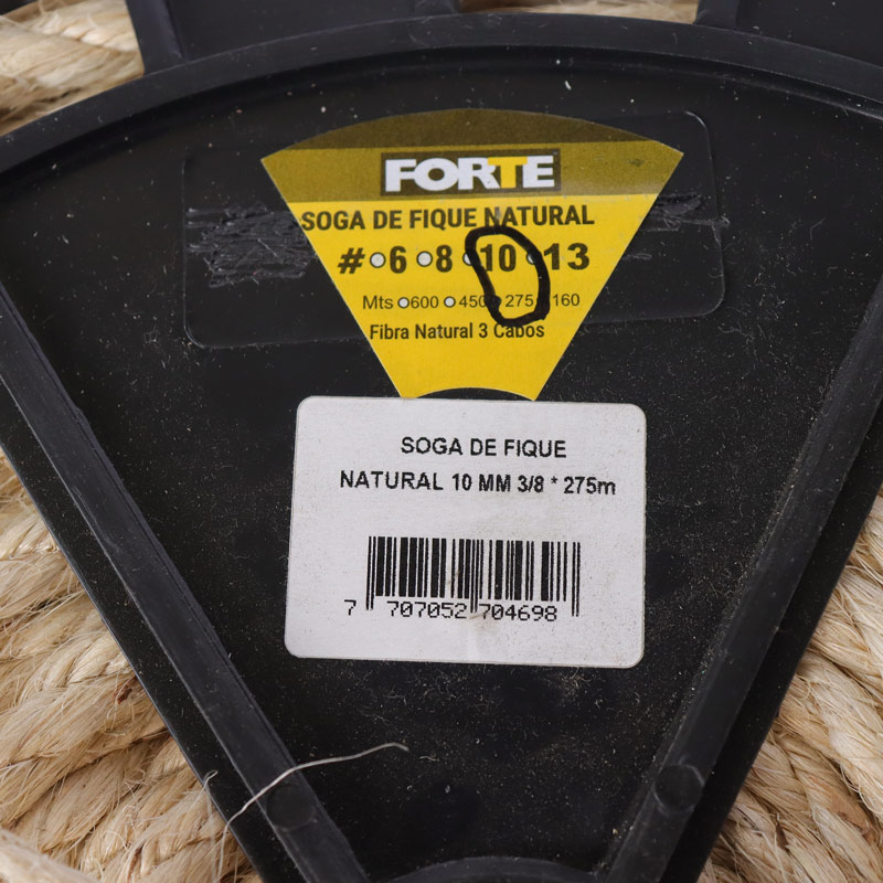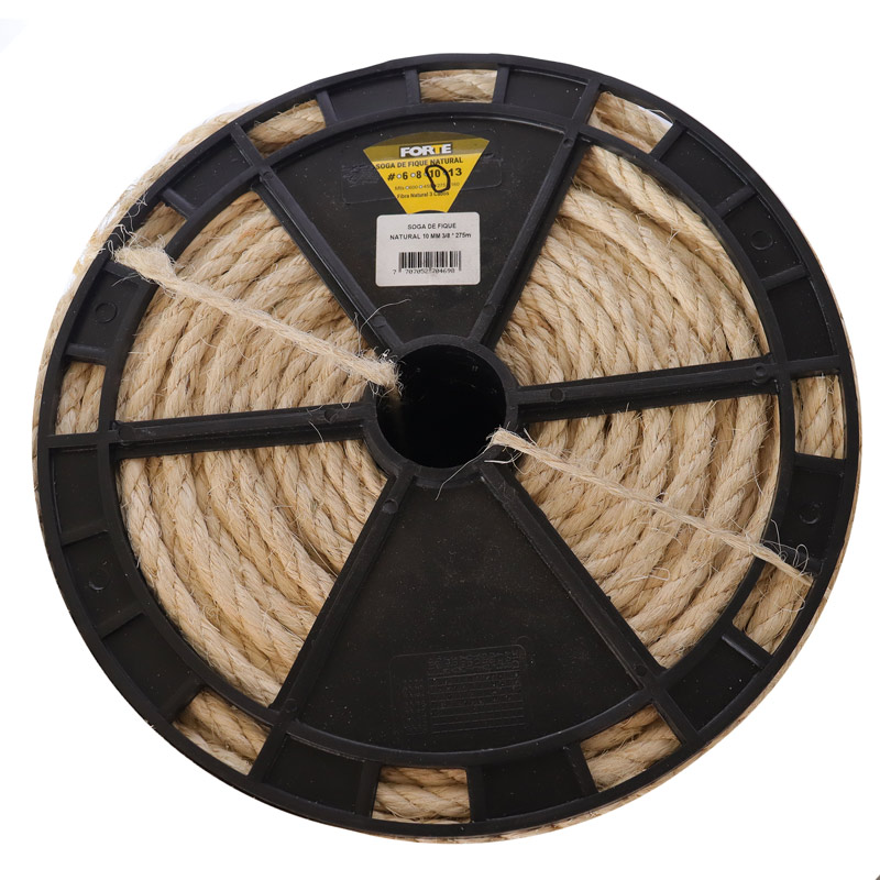 Soga de fibra natural biodegradable de 3 cabos hecha con filamentos de color natural largos de alta resistencia carreta con una altura de 34 cms, cantidad de producto 275 metros, tapa diametro de 30 cms producto de uso industrial, ganadero y para el gremio de carga vehicular.