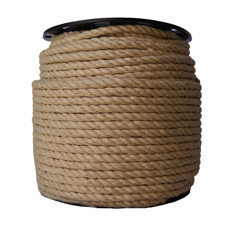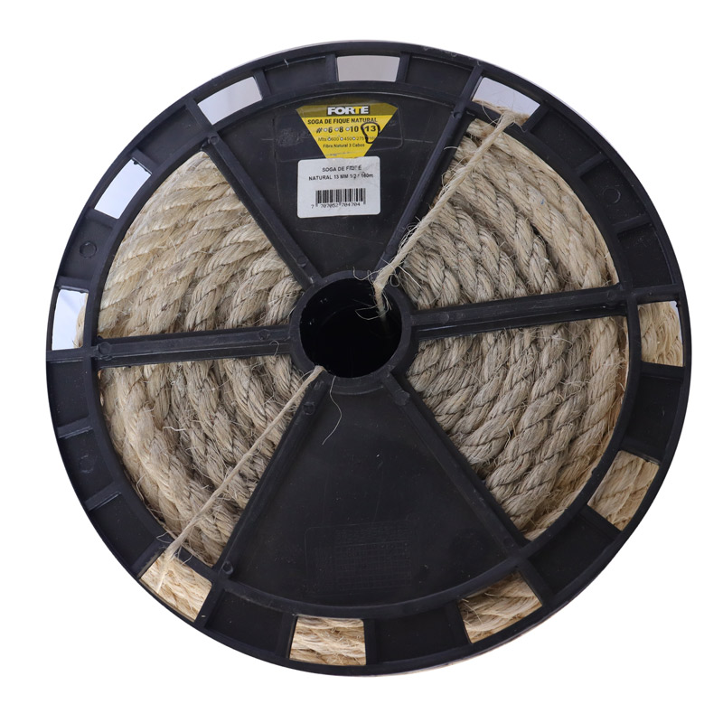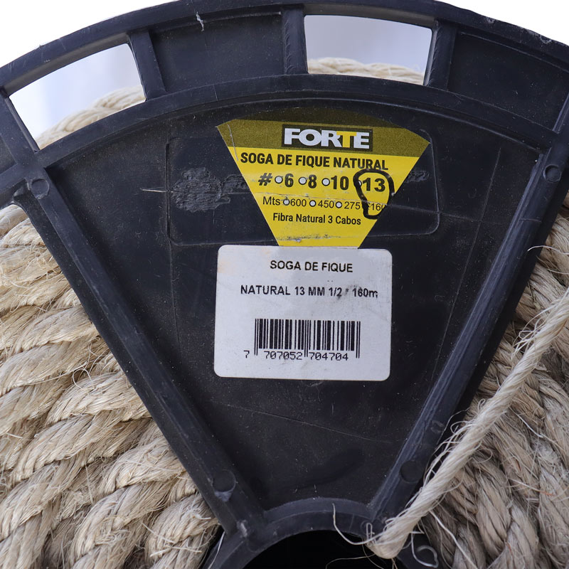 Soga de fibra natural biodegradable de 3 cabos hecha con filamentos de color natural largos de alta resistencia carreta con una altura de 43 cms, cantidad de producto 160 metros, tapa diametro de 30 cms producto de uso industrial, ganadero y para el gremio de carga vehicular.