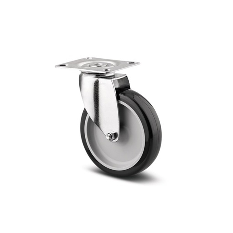 Rueda giratoria, Soporte de chapa de acero zincado, rodamiento giratorio de dos hileras de bolas, pletina de fijación. Núcleo de la rueda de Polipropileno, bandaje de poliuretano, buje liso diametro de la rueda 100 mm. capacidad de carga de la rueda 75 kg ideal para aplicaciones ferreteras, muebles livianos, mesas auxiliares, maletas, gondolas, vitrinas y diversos componentes de ligero peso, equipos hospitalarios pequeños, bases para neveras, carro liviano de lavandería y mesas auxiliares.