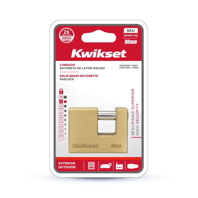 Los candados de bayoneta Kwikset® de latón son una excelente opción para las necesidades de seguridad de uso profesional y cotidiano. Adecuado para puertas enrollables o puertas de camiones, los mismos evitan los ataques de los cortadores de pernos. Estos candados de latón macizo utilizan una barra transversal de acero endurecido que gira para evitar ataques de sierra. Además, los pasadores de latón y los resortes de acero inoxidable brindan alto rendimiento a largo plazo.