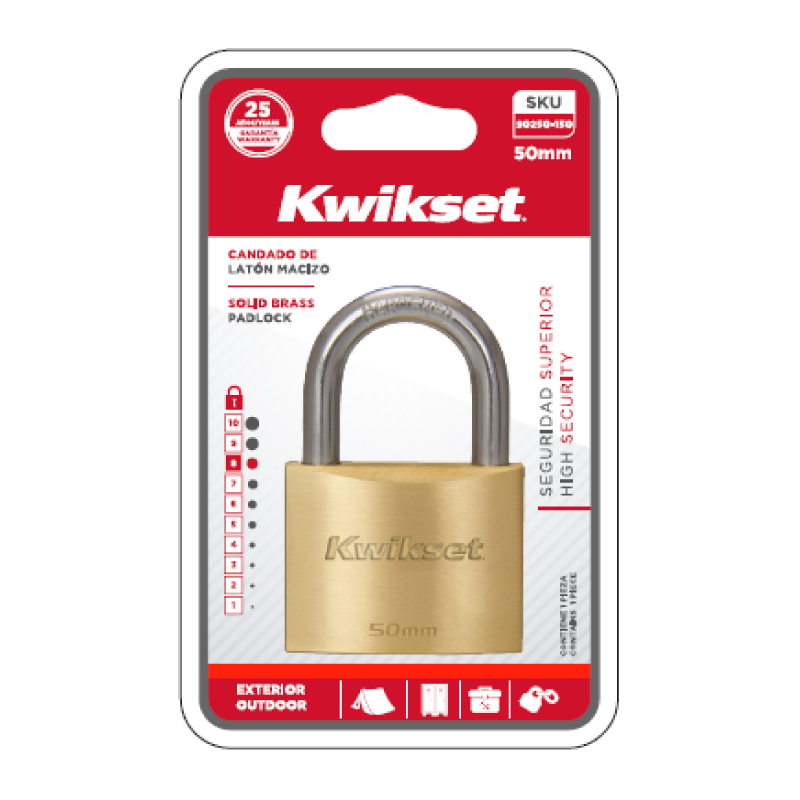 Los candados cuello estándar Kwikset® de latón son adecuados para uso en interiores y exteriores. Construidos con cuerpo y pasadores de latón, resortes de acero inoxidable y un grillete de acero endurecido de doble bloqueo, estos candados brindan resistencia, seguridad y tranquilidad para aplicaciones residenciales y comerciales.