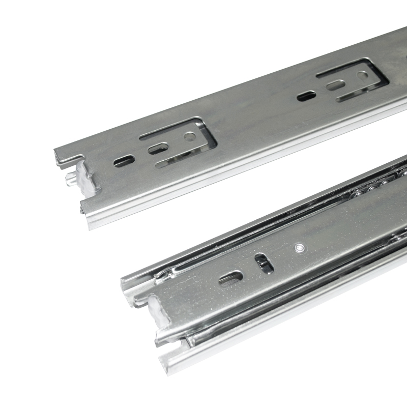 Riel de extensión total de carga media, fabricado en acero con recubrimiento galvanizado para mayor resistencia y durabilidad. Diseñado para soportar hasta 30 kg por par y con una vida útil de 25.000 ciclos de uso. Ideal para cajones en escritorios, muebles comerciales, residenciales y gabinetes de cocina donde se requiere una apertura completa. Disponible en longitudes de 250, 300, 350, 400, 450, 500 y 550 mm.