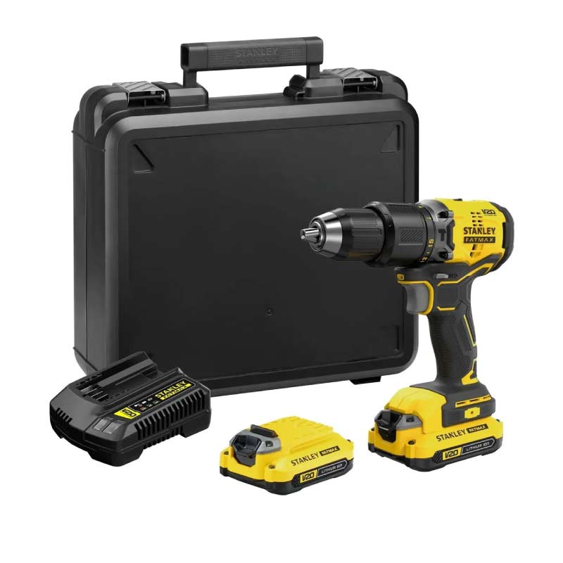 Taladro percutor sin escobillas Stanley 20v fatmax mandril de 1/2" (13 mm), sin llave para un cambio de broca rápido y fácil, 16 posiciones de torque, luz led para iluminar el área de trabajo y mejorar la visibilidad, batería v20 de ión de litio de tecnología mejorada, mayor duración, autodescarga mínima y sin efecto memoria. Mango ergonómico mayor comodidad en las aplicaciones más exigentes, interruptor con módulo electrónico control de velocidad variable y protección contra sobrecargas, 2 modos: atornillador y martillo percutor 32,300 ipm, 2 velocidades 0-600 / 0-1900 rpm. Incluye: 2 baterías + 1 cargador + 1 empaque (caja plástica o bolso de lona, según disponibilidad)