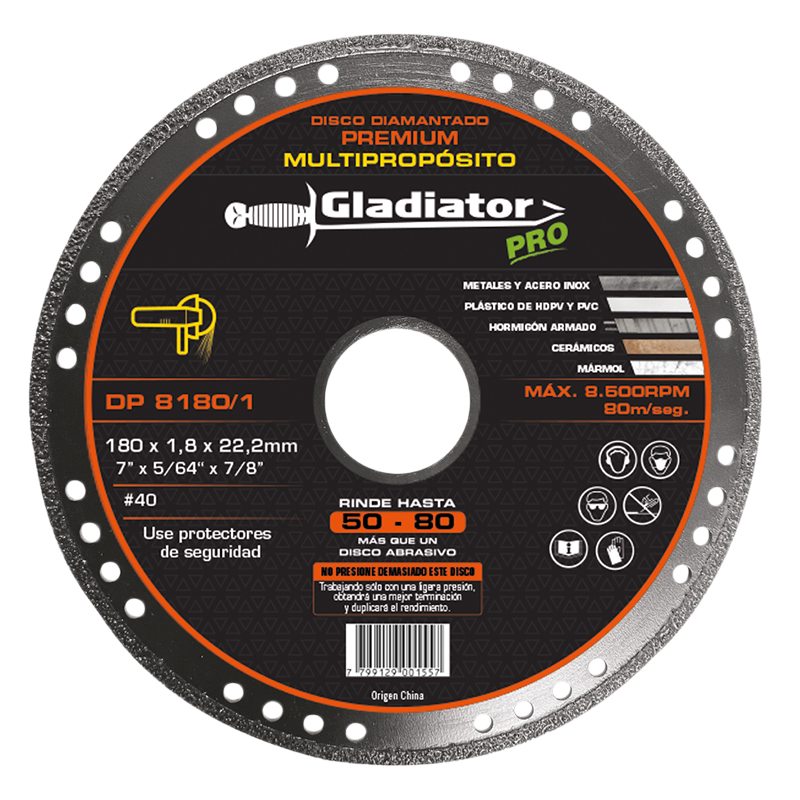 Disco Premium diamantado continuo multiproposito. Medidas: 7"x 5/64 x 7/8" (180x1,8x22,2 mm). Velocidad máxima 8500 RPM. Grano 40. Soldado al vacío. Para corte de metal, acero inoxidable, plástico de HDPV y PVC, hormigón armado, cerámicos y mármol. Rinde entre 50 y 80 veces más que un disco abrasivo. Limpio de chispas, no se rompe, ecológico, corte suave, más seguro, menos humo y polvo.