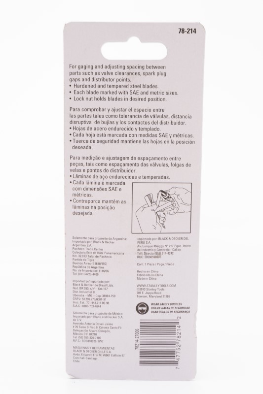 Para comprobar y ajustar el espacio entre las partes, tales como tolerancia de válvulas, distancia disruptiva de bujías y los contactos del distribuidor. 30 hojas de acero y 6 hojas de latón no-magnético para aplicaciones de encendido electrónico. Cada hoja está marcada con medidas SAE y métricas. Tuerca de seguridad mantiene las hojas en la posición deseada. 36 Hojas · Contenido · 0.002, 0.0025, 0.003, 0.004, 0.005, 0.006, 0.007, 0.008, 0.009, 0.010, 0.011, 0.012, 0.013, 0.014, 0.015, 0.016, 0.017, 0.018, 0.019, 0.020, 0.021, 0.022, 0.023, 0.024, 0.025, 0.026, 0.028, 0.030, 0.032 & 0.035 pul Magnético (0.051