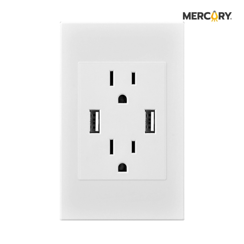 Toma sencillo polo tierra + usb x2 mercury premium white, ideal para la conexión de equipos eléctricos y equipos que se conecten por medio de USB.