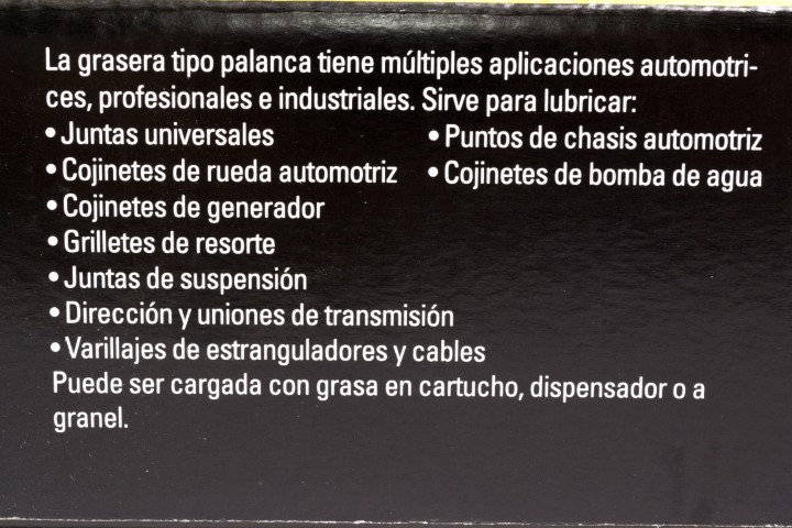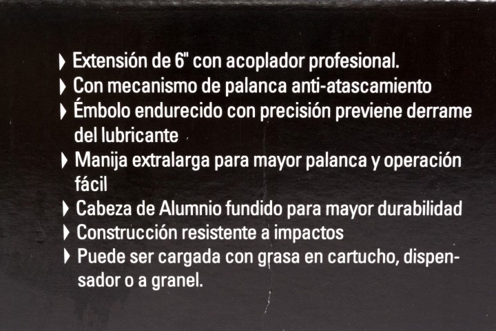 [95-IB] 78-031. Con mecanismo de palanca anti-atascamiento. 14 oz Volumen (400 g) · 6 pulgadas de Largo (150 mm) - 8.000 PSI de Presión. Émbolo endurecido a precisión previene derrame del lubricante. Manija extra larga para mayor palanca y operación fácil. Cabeza rugosa para mayor durabilidad y construcción resistente a fuertes impactos