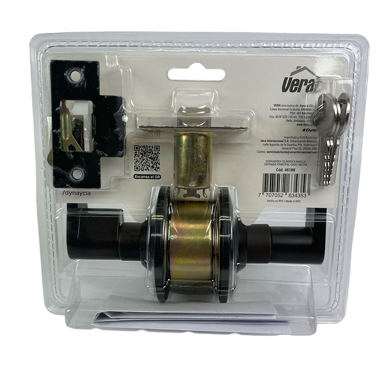 Cerradura Cilíndrica con Manija Metálico en Acabado Negro, Diseñada para brindar seguridad y elegancia, esta cerradura cilíndrica cuenta con un elegante acabado en negro, aportando un toque moderno y sofisticado. Su cilindro de zamak, disponible en versiones para alcoba y entrada, garantiza un mecanismo confiable y duradero. Con un centro de instalación de 60mm (2-3/8") y roseta de 65mm, es compatible con puertas de 35 a 50mm de espesor, permitiendo una instalación sencilla. Incluye 3 llaves de acero con acabado niquelado.