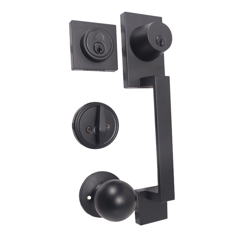 Juego de entrada principal con acabado pintura negra para bloquéo instantáneo de puertas. Apertura desde el exterior únicamente con llave. Función de misma llave en la cerradura y el cerrojo auxiliar. Se acciona desde el interior con pomo en la cerradura y con perilla en el cerrojo. Cuerpo fabricado en aleación de zinc de alta resistencia, mecanismo interior y llaves en latón. Distancia de instalación al canto de la puerta (backset) ajustable de 60 a 70mm. Para instalación en puertas con espesores entre los 40 y 55mm.