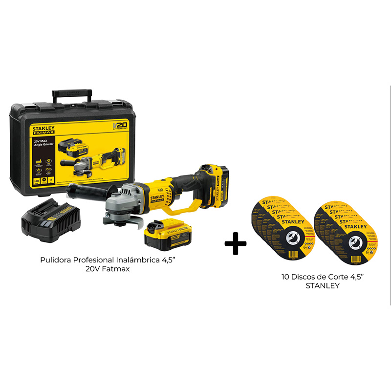 Combo que incluye la nueva pulidora inalámbrica Stanley 20v fatmax 4,5" con 2 baterías de 4ah + cargador + estuche. Con tecnología de batería mejorada, sin efecto memoria y mínima auto descarga, potente motor de alto rendimiento que proporciona 9000 rpm para aplicaciones agresivas. La caja de engranajes de metal fundido disipa el calor durante periodos prolongados de uso. Mango de 3 posiciones para mayor comodidad y control. Interruptor de bloqueo para reducir la fatiga durante el uso prolongado más 10 discos de corte 4,5" de la marca Stanley.