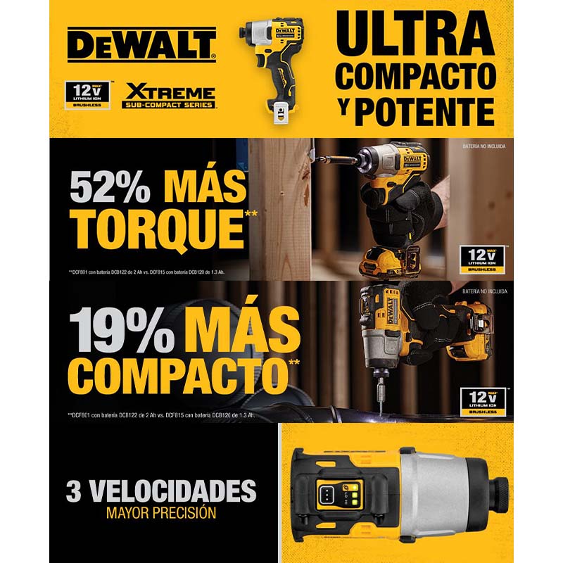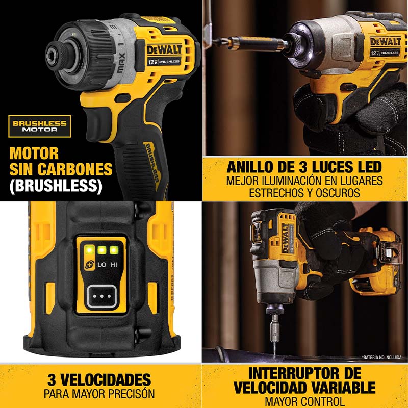 Atornillador de impacto inalámbrico, mandril de 1/4" drop & load para cambios rápidos, herramienta del sistema 12V Dewalt, cuenta con caja de engranajes metálicos, ultracompacto de la familia extreme, motor sin carbones y anillo de 3 luz led, 3 velocidades (alto, bajo y precisión drive) que proporcionan mayor precisión, interruptor de velocidad variable. Solo herramienta (Sin batería ni cargador)