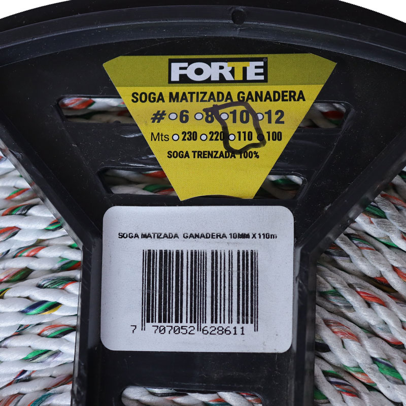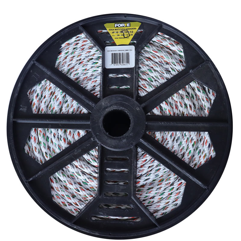 Soga trenzada al 100% trenzada sin alma con acabado de diferentes tonos carrete x 110 metros hecho con polipropileno al 20% de alta tenacidad y poliester texturizado al 80%. Dimensiones del carrete altura 20 cm, tapa diametro 30 cms. Producto multiusos en zonas ganaderas, vehiculos de carga. No se recomienda para uso deportivo.