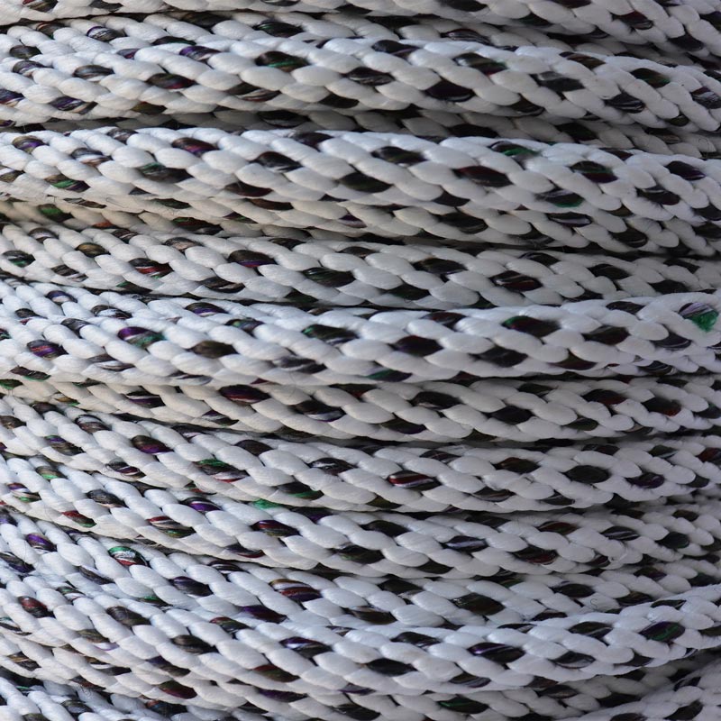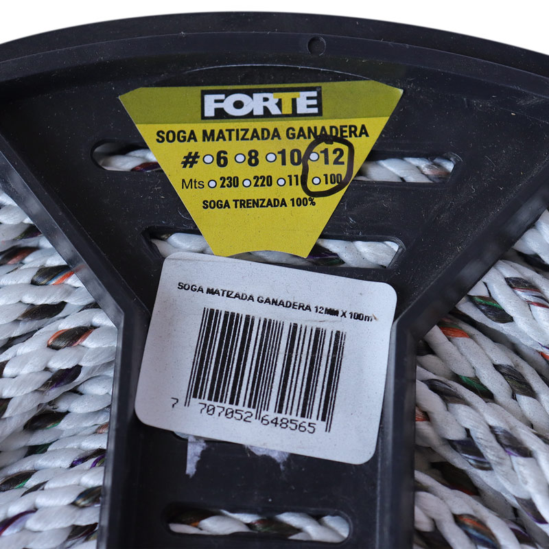 Soga trenzada al 100% trenzada sin alma con acabado de diferentes tonos carrete x 100 metros hecho con polipropileno al 20% de alta tenacidad y poliester texturizado al 80%. Dimensiones del carrete altura 20 cm, tapa diametro 30 cms. Producto multiusos en zonas ganaderas, vehiculos de carga. No se recomienda para uso deportivo.