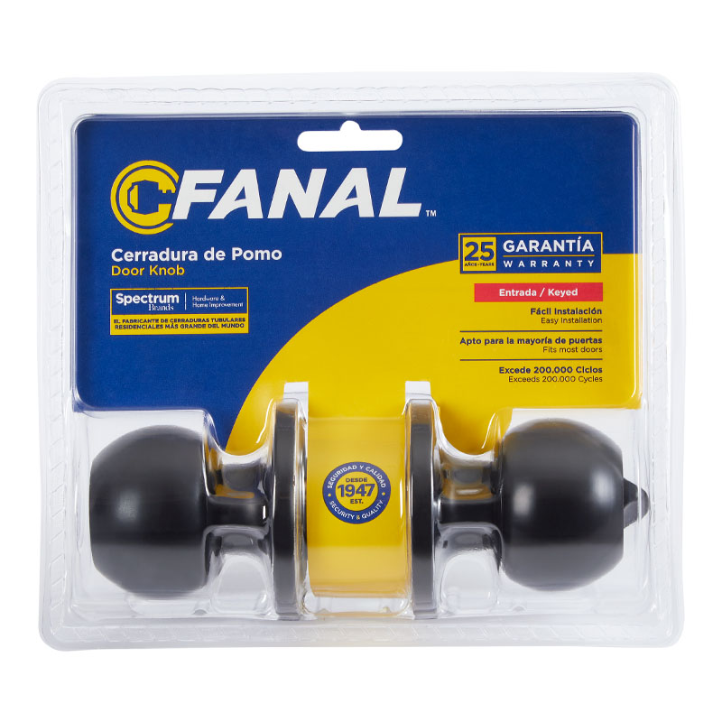 Cerradura de POMO para Alcoba y/o Habitación con Mecanismo Tubular.Fabricada en Acero Inoxidable, Acabado Negro Mate. Muy facil de instalar no requiere ser un cerrajero experto para poder instalarla. Llaveo: Bocallave y Mecanismo de Tambor de 5 Pines que Permite Mayor Seguridad. Centro de Puerta tradicional a 60mm - 70mm y para Espesores de Puerta Convencionales (35mm - 48mm). Roseta interna y externa circular. Viene con 3 llaves y en empaque tipo clear pack. Dimensiónes del Pomo, Alto: 65mm, Ancho 69mm.