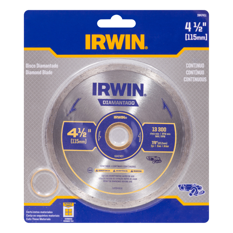Diametro del Disco 4.1/2" ( 115mm) - Eje 22.22 mm - Velocidad Máxima 13.300 RPM - Casquillos 20.00 e 15.88 - Corte seco y con agua. El Disco continuo es ideal para corte de Azulejos, Ceramica, Marmol y Porcelanato. Antes item 315