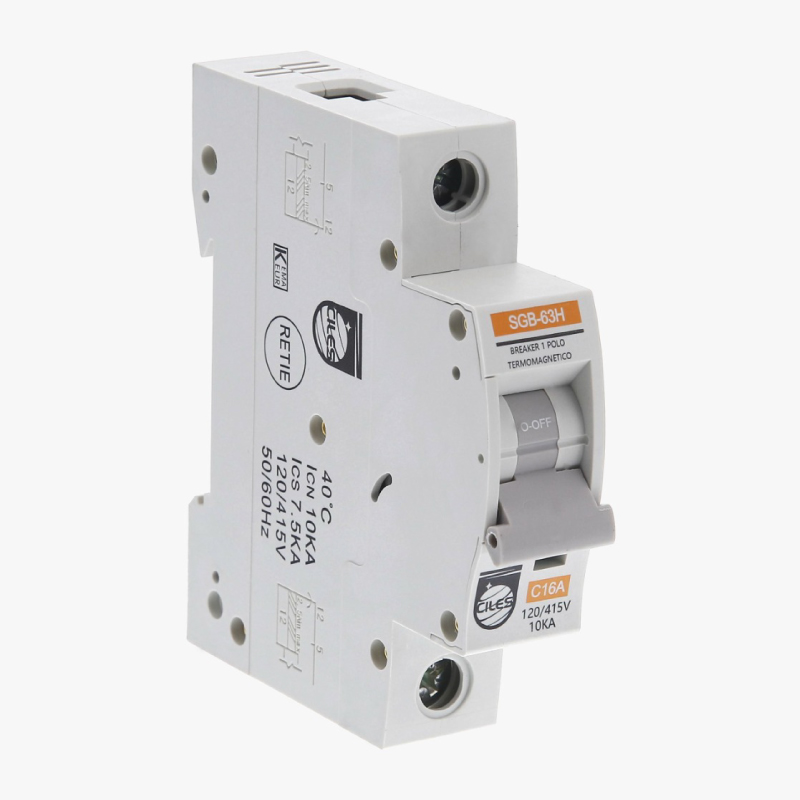 Breaker termomagnético Riel DIN para protección y distrib. de circuitos eléctricos en baja tensión contra sobrecargas y cortocircuitos, eficiente por su doble protección térmica y magnética. Montaje en riel omega, Material Poliamida termoplástico, Color Gris claro, Contacto cobre estañado, Indice de proteccion IP20, Indicador estado de operación on/off, Polos 1-2 y 3, Terminal de conexíon con Borne tornillo prisionero, Stma de conexion barra tipo peine, Frecuencia de oper AC 60 Hz, Curva disparo Tipo C, Rango de temp -5°Ca40°C, In Capacidad cte nominal (Amperios) 16/20/32/40/50/63, Icc Corriente de corto circuito (KA) 10KA Ue= Tensión Nom (V) 120/240/415,Ui= Tensión impulso (KV) 4, Clase de