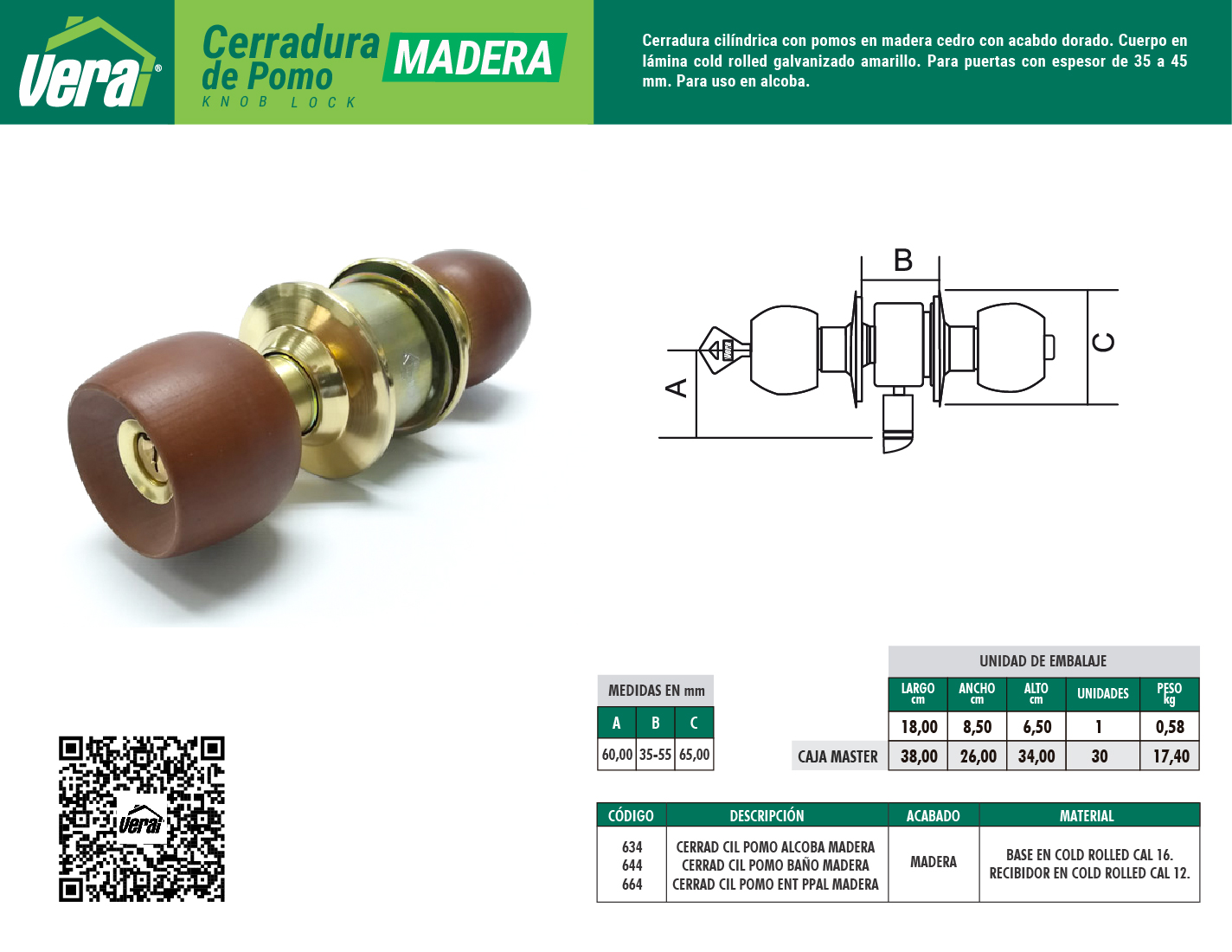 Cerradura Cilíndrica con Pomo de Madera Elegante y funcional, esta cerradura cilíndrica está diseñada para alcobas y baños, combinando la calidez del pomo de madera con la resistencia de sus piezas metálicas externas en acabado de latón pulido. Cuenta con un cilindro de latón (alcoba, entrada) para mayor seguridad y durabilidad. Su centro de instalación de 60mm (2-3/8") y roseta de 65mm permiten una fácil adaptación a puertas con un espesor de 35 a 50mm. Incluye 3 llaves de acero con acabado niquelado. Hasta 85000 mil ciclos, empaque caja