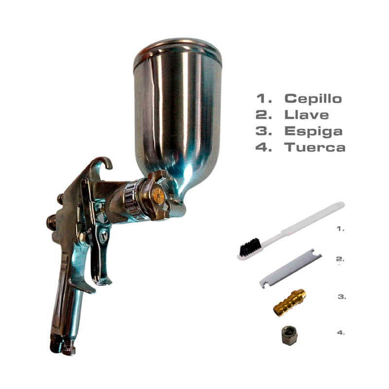 Pistola de bajo volumen y mediana presión, ideal para múltiples usos y velocidad optima de aplicación, cuenta con perilla de ajuste de fluido de fácil manejo que le permite aumentar o disminuir el volumen del liquido./ Material: Aluminio Reforzado / Presión: 30 PSI - 50 PSI / Altura: 12,5 cm / Ancho: 20 cm / Largo 21 cm / Peso 670 gr / Caja Master: 8 ud. / Tornillo Regulador de abanico / Tornillo de Ajuste / Agarre con estrías antideslizamiento / Gatillo de manejo suave / Entrada de Aire 1/4 NPT / Capacidad: 400 ml