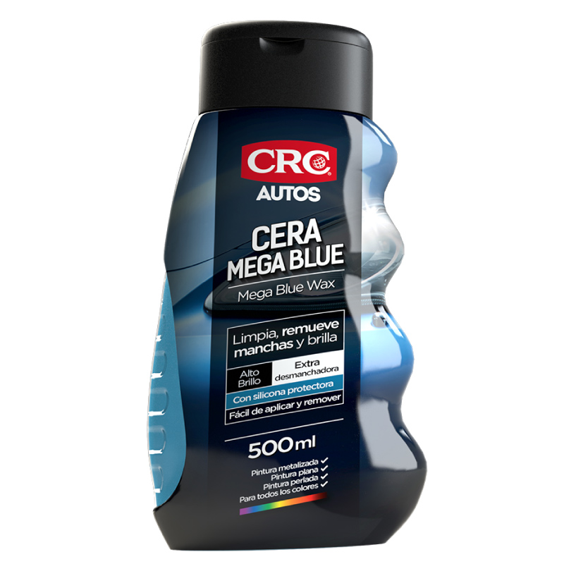La Cera Mega Blue de CRC es una cera liquida ideal para todo tipo de pintura y para todos los colores. Formula especializada para desmanchar la pintura en un solo paso. Desmancha, brilla y protege la pintura de las condiciones atmosféricas. Forma una capa protectora que repele el polvo y el agua, evitando el desgaste de la pintura. Con mayor contenido de abrasivo para quitar esas manchas difíciles. Remueve asfalto, grasa y micro rayones. Con ceras y siliconas especializadas que permiten obtener alto brillo.