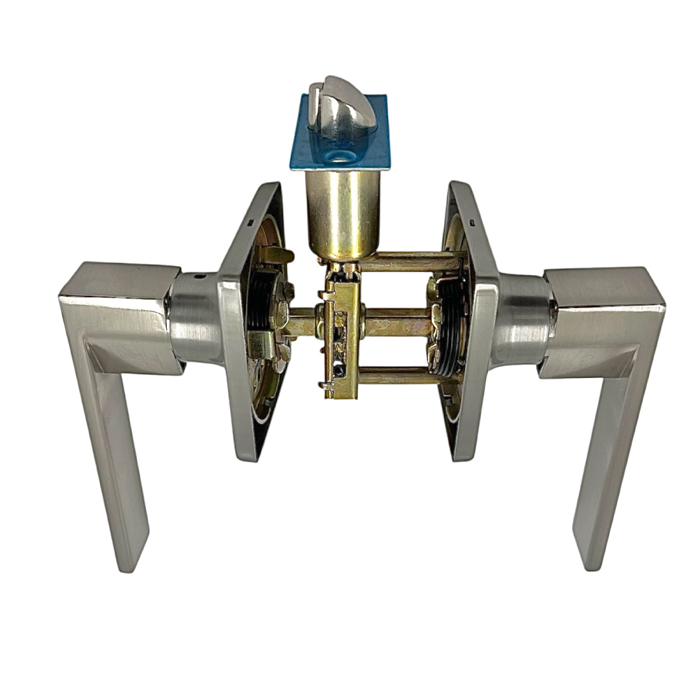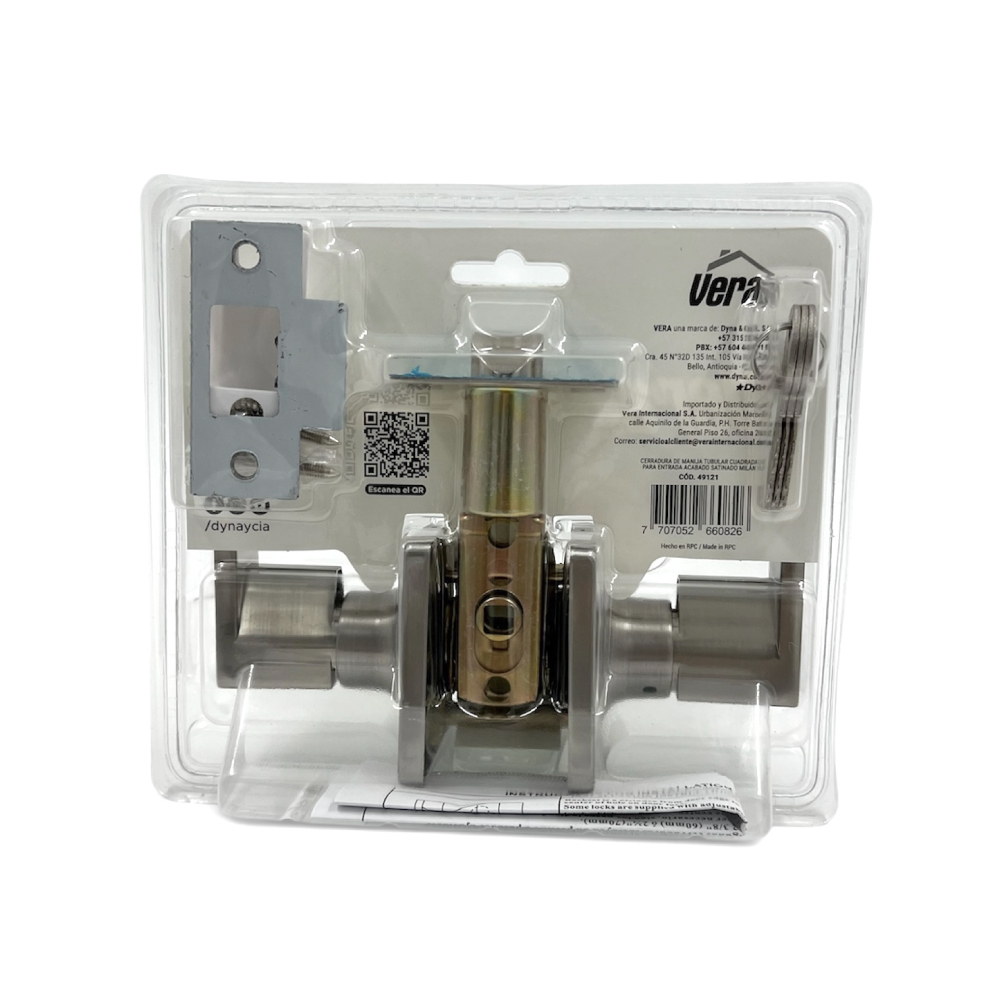 "Cerradura tubular con manija en aleación de zinc y roseta cuadrada de acero inoxidable de 65 mm. El cilindro se encuentra en el exterior, mientras que el interior es ciego para mayor seguridad. Incluye tapón de aleación de zinc, carcasa de aluminio y 3 llaves de hierro de 1,8 mm.Cuenta con pestillo ajustable con retroceso de 60 mm a 70 mm y cara de pestillo con espesor de 1,2 mm. Compatible con puertas de 35 a 45 mm de grosor.Ideal para entradas principales, combina resistencia, seguridad y diseño. Su estructura tubular permite una instalación rápida y práctica, mientras que su acabado satinado brinda un estilo moderno y sofisticado adaptable a diversos espacios residenciales o comerciale