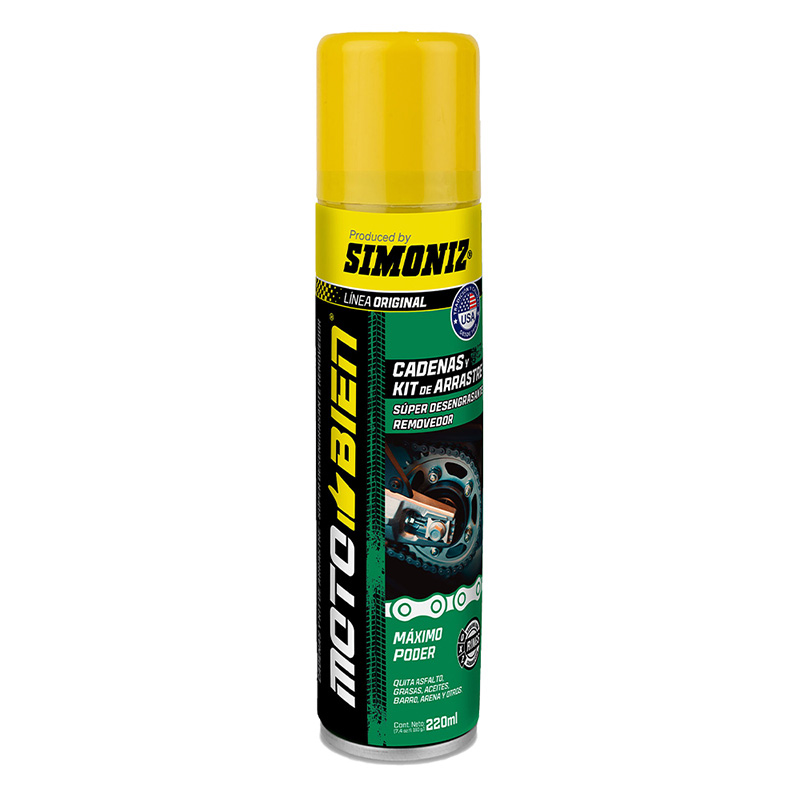 Simoniz Moto Bien Cadenas Limpiador, es un desengrasante que limpia, su potente formulación elimina la grasa, arena, tierra, barro, partículas de asfalto, aceite y todo tipo de contaminantes que se adhieren a las cadenas y componentes mecánicos de las motocicletas. Su efecto de rápida evaporación permite una limpieza inmediata. Es completamente seguro con los O-Rings X-Rings Y Z-rings de las cadenas.