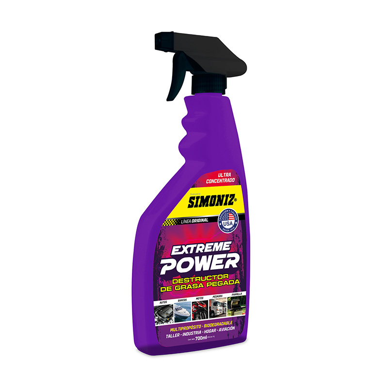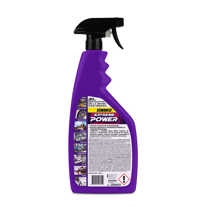 El destructor de la grasa más pegada, extreme power, formula industrial de alta potencia que disuelve rápidamente suciedad extrema con fuerza profesional. Penetra y elimina grasa difícil, líquidos de motores y transmisión, kit de arrastre de motos, alquitrán, asfalto, resinas y suciedad acumulada en campanas de restaurante y hoteles, entre otros producto de higiene doméstica. Producto de uso industrial.