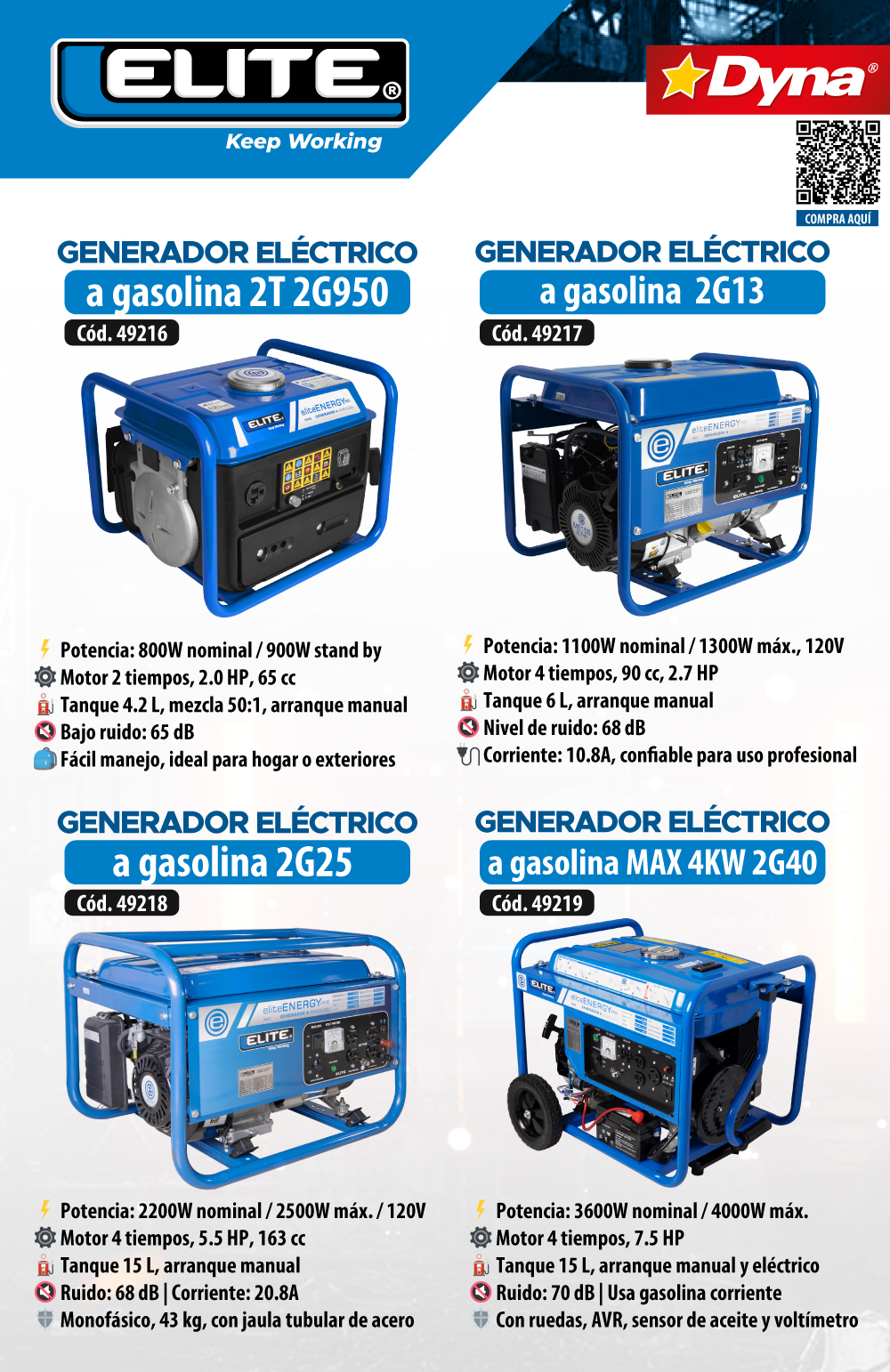 Generador eléctrico a gasolina 2 tiempos de 900W, es un equipo compacto y eficiente, ideal para uso doméstico o en exteriores. Ofrece 900 W en modo stand by y 800 W de salida nominal, con voltaje AC 120V y rango de salida de 7.5 A. Funciona con un motor de 2 tiempos de 2.0 HP a 3600 rpm, cilindraje de 65 cc y mezcla de combustible 50:1. Su arranque es manual, el tanque tiene una capacidad de 4.2 litros, y opera con un nivel de ruido de 65 dB. Es monofásico y factor de potencia de 1.0. Entre sus beneficios se destacan su diseño compacto, fácil manejo, y funcionamiento silencioso. Incluye 1 año de garantía y respaldo en Centros Fixer.
