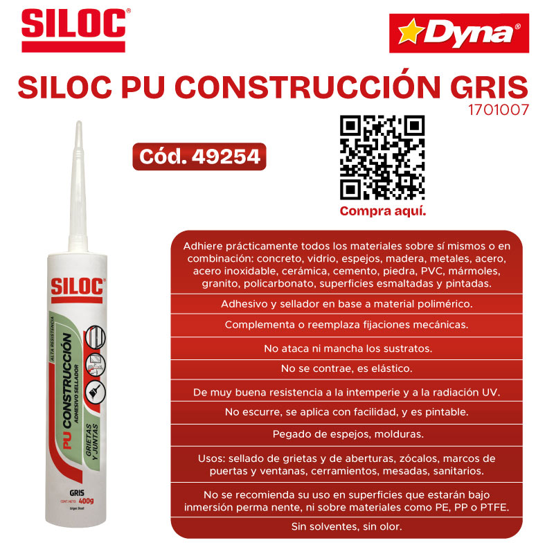 Adhesivo y sellador en base a material polimérico. Adhiere prácticamente todos los materiales sobre sí mismos o en combinación: concreto, vidrio, espejos, madera, metales, acero, acero inoxidable, cerámica, cemento, piedra, PVC, mármoles, granito, policarbonato, superficies esmaltadas y pintadas. Complementa o reemplaza fijaciones mecánicas. No ataca ni mancha los sustratos. No se contrae, es elástico. De muy buena resistencia a la intemperie y a la radiación UV. No escurre, se aplica con facilidad, y es pintable. Sin solventes, sin olor. No se recomienda su uso en superficies que estarán bajo inmersión permanente, ni sobre materiales como PE, PP o PTFE. Usos: sellado de grietas y de abertu